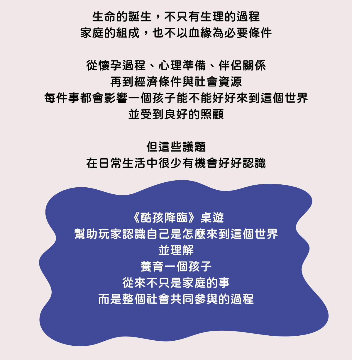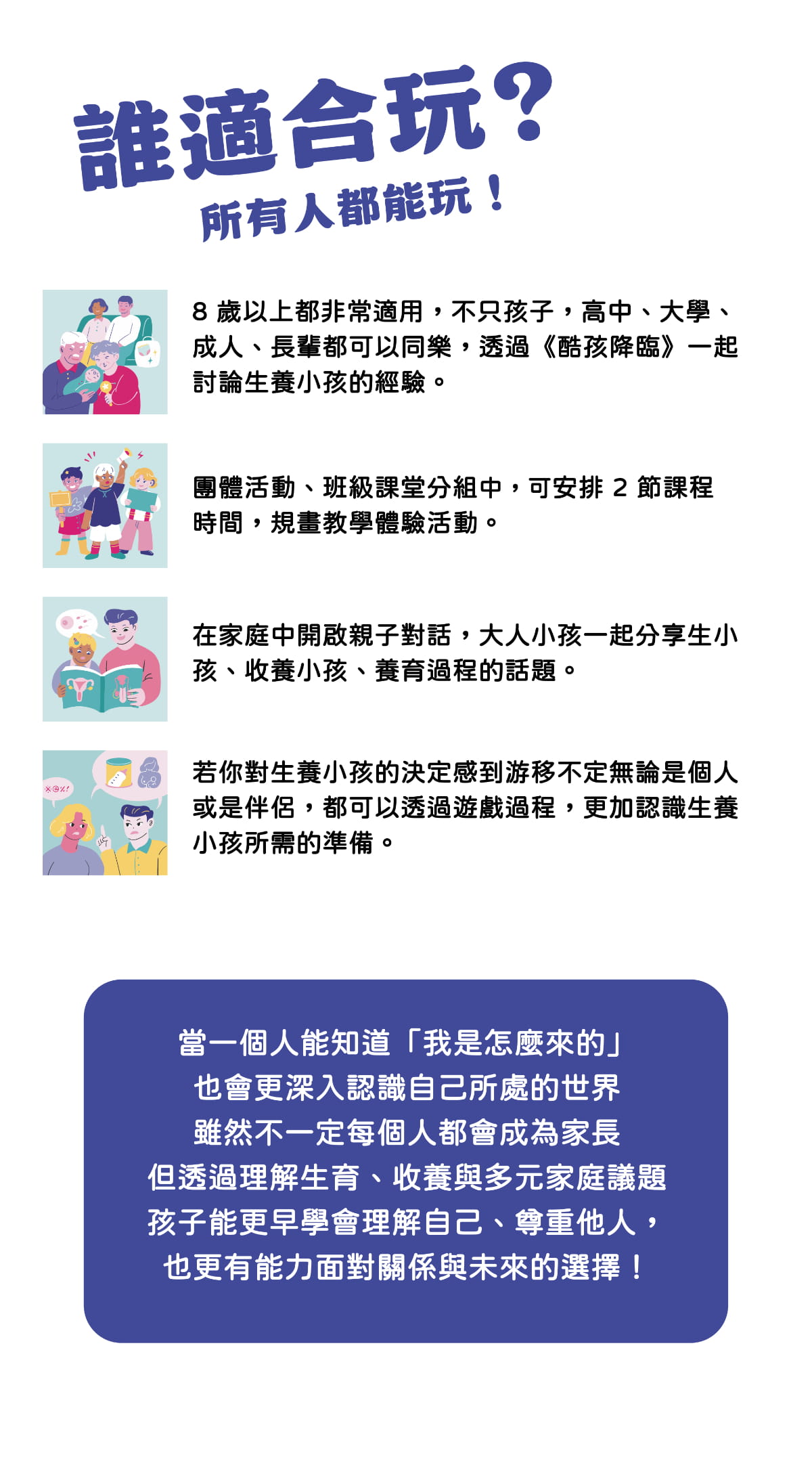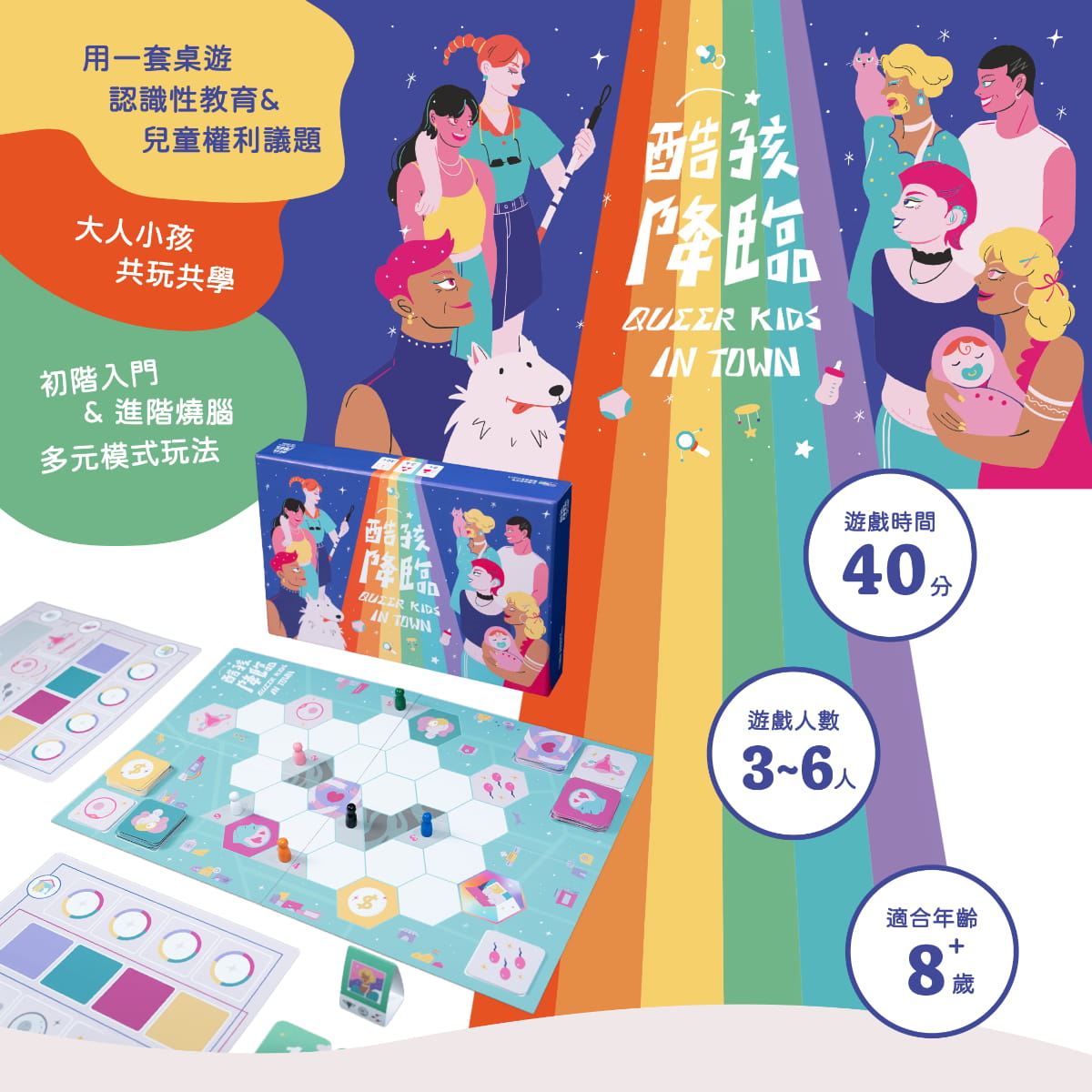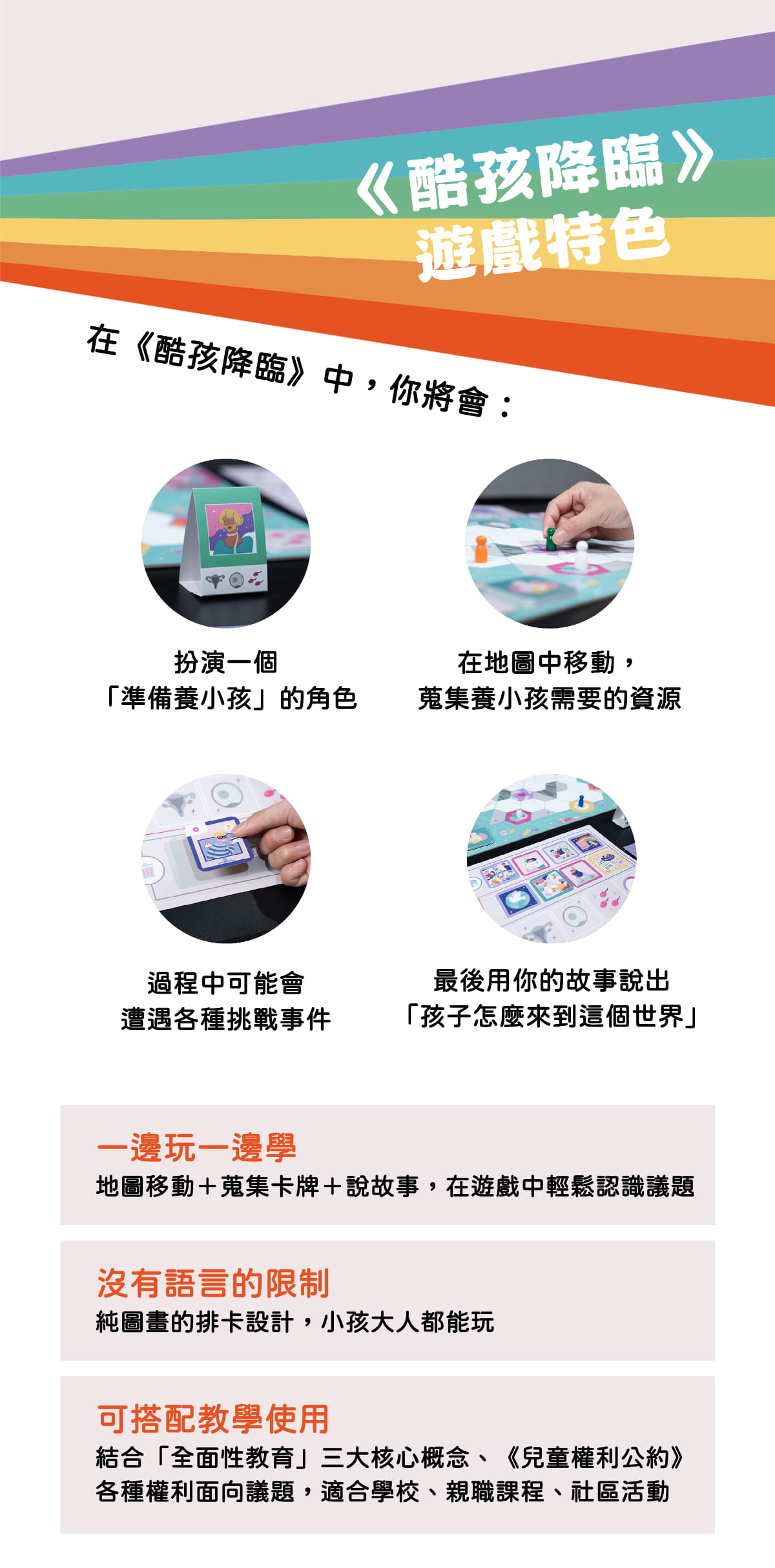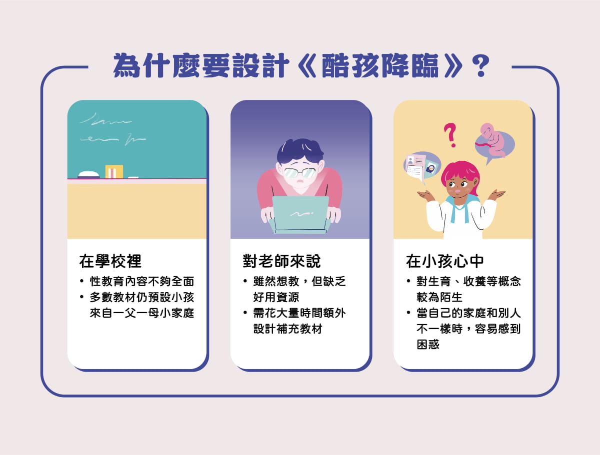 《酷孩降臨》是一款結合「全面性教育」與《兒童權利公約》的桌遊教材,讓大人與小孩透過遊戲,一起認識性、家庭與人權議題。玩家將扮演不同背景的角色,在模擬生育或收養的過程中,蒐集資源、面對挑戰,重新思考「養一個孩子」到底需要什麼。